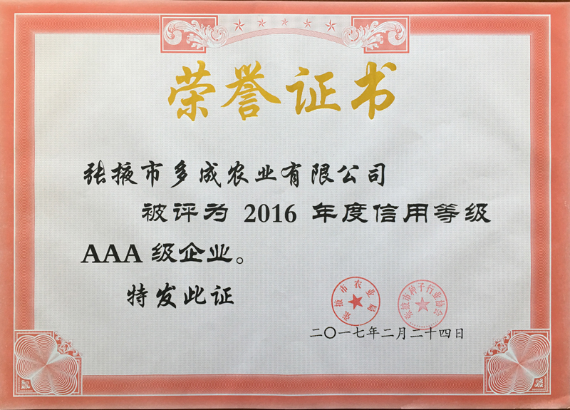 | 熱烈祝賀多成農(nóng)業(yè)榮獲2016年度信用等級AAA企業(yè)稱號 | ||