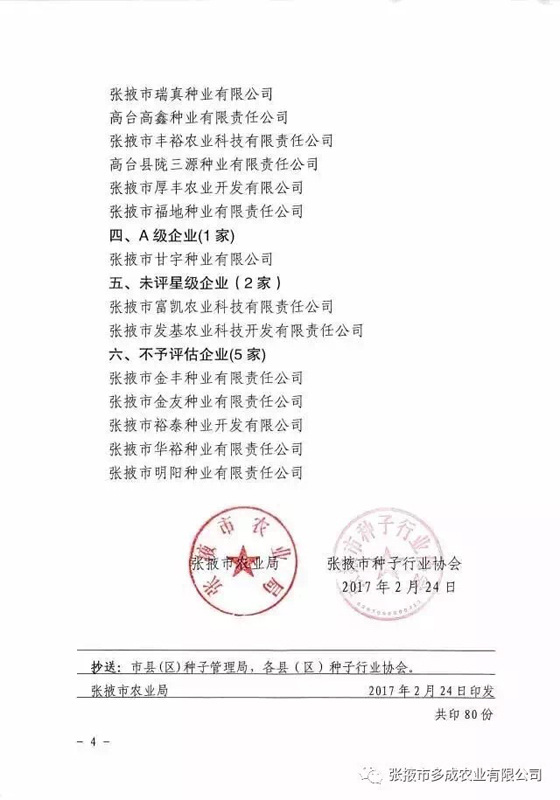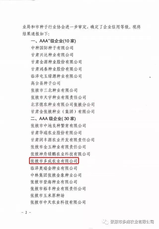 熱烈祝賀張掖市多成農(nóng)業(yè)有限公司被評為2017年度信用等級AAA級企業(yè)。 2017年2月24日,張掖市農(nóng)業(yè)局、張掖市種子行業(yè)協(xié)會公布的《2016年度玉米種子企業(yè)信用等級評估結(jié)果》中,張掖市多成農(nóng)業(yè)有限公司被評為2016年度信用等級AAA級企業(yè)。 |